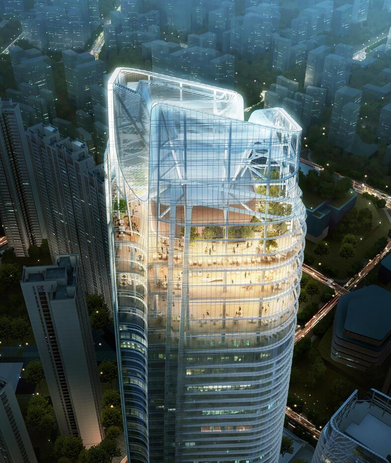 該項(xiàng)目是華僑城集團(tuán)投資建設(shè)的第一個(gè)超高層全異形單元式幕墻,整體造型復(fù)雜、穿插疊合、相互連接,且幕墻系統(tǒng)分散,工作面廣,施工難度系數(shù)極高,為國(guó)內(nèi)首例。