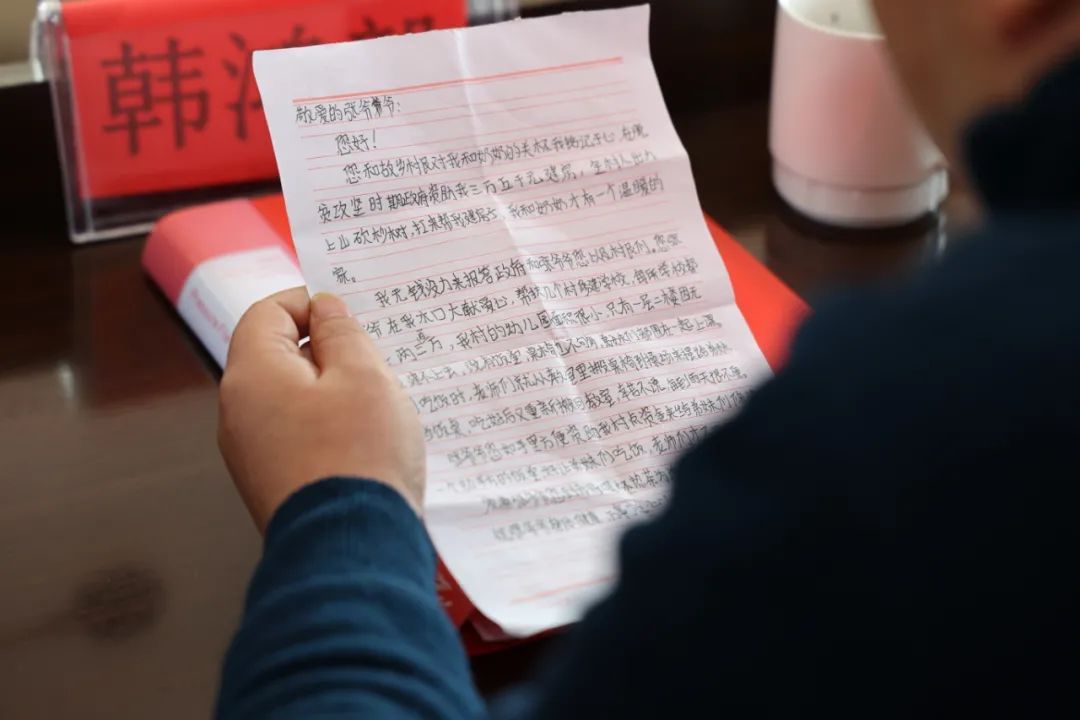 圖 | 黎平縣政協副主席韓鴻毅朗讀受資助的貧困兒童寫的感謝信
